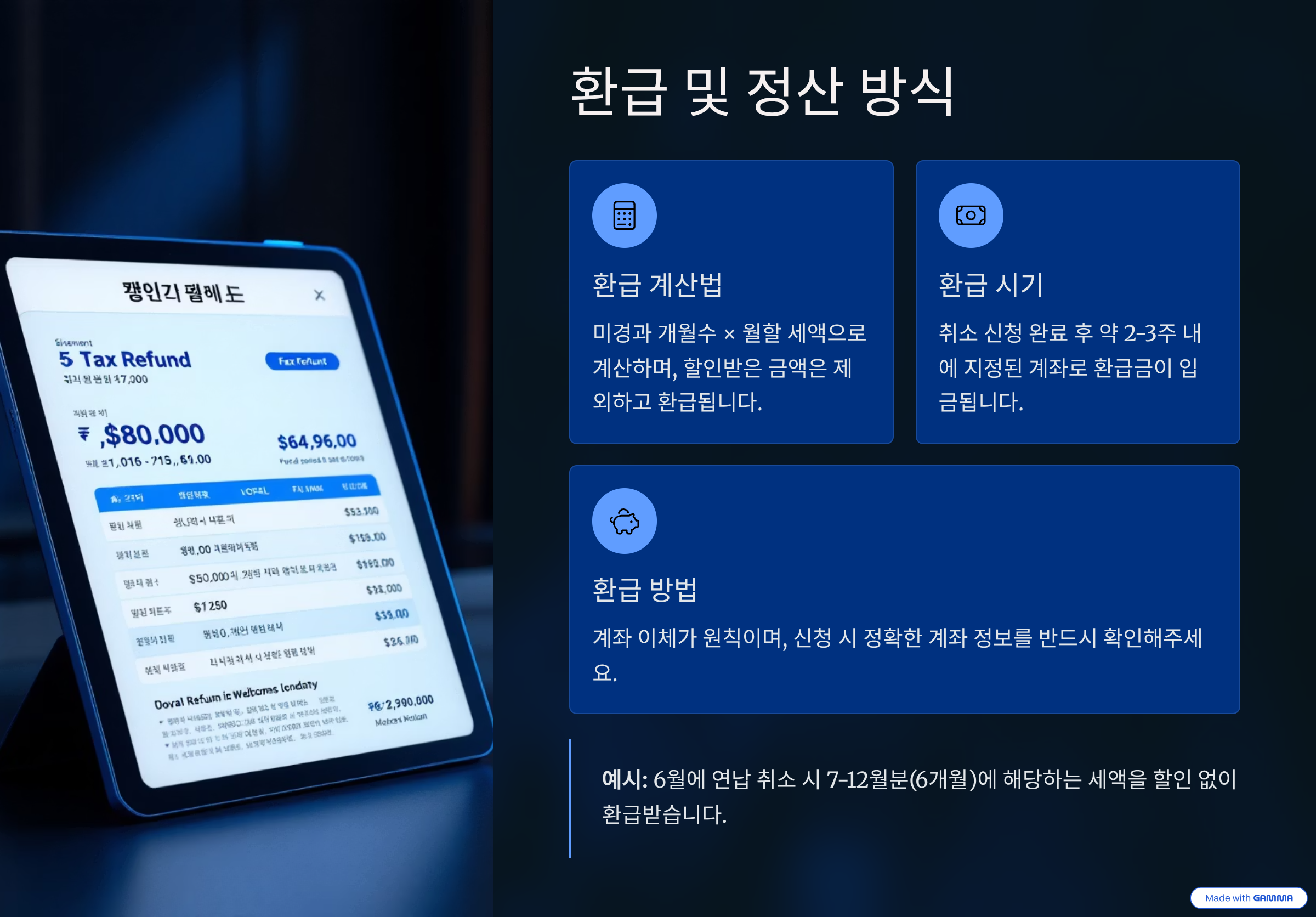 정산 방식은 다음과 같아요. 1월 연납 기준으로, 1개월은 연납가의 약 8.33%예요. 즉 12개월 기준으로 나누는 셈이죠. 하루 단위로 계산되는 게 아니라서 중간 날짜에 말소하면 해당 월은 포함되지 않아요.