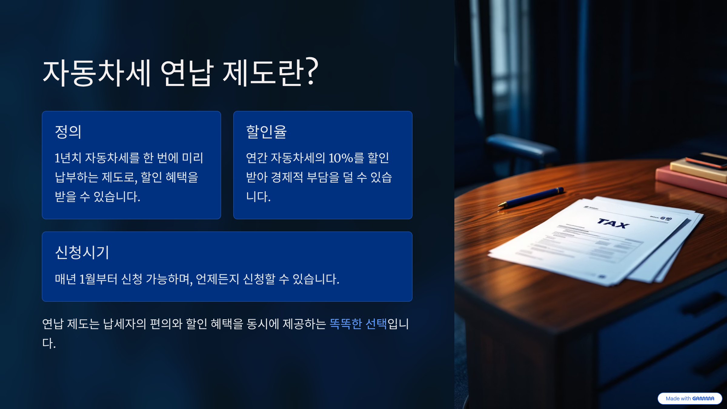 이 제도는 특히 장기적으로 차량을 보유할 계획이 있는 분들에게 인기가 많아요. 연납 시점은 보통 1월, 3월, 6월, 9월 네 번으로 나뉘는데, 월이 지날수록 할인율은 조금씩 줄어드는 구조예요. 예를 들어 1월에 연납하면 가장 많은 혜택을 받아요! 🎉