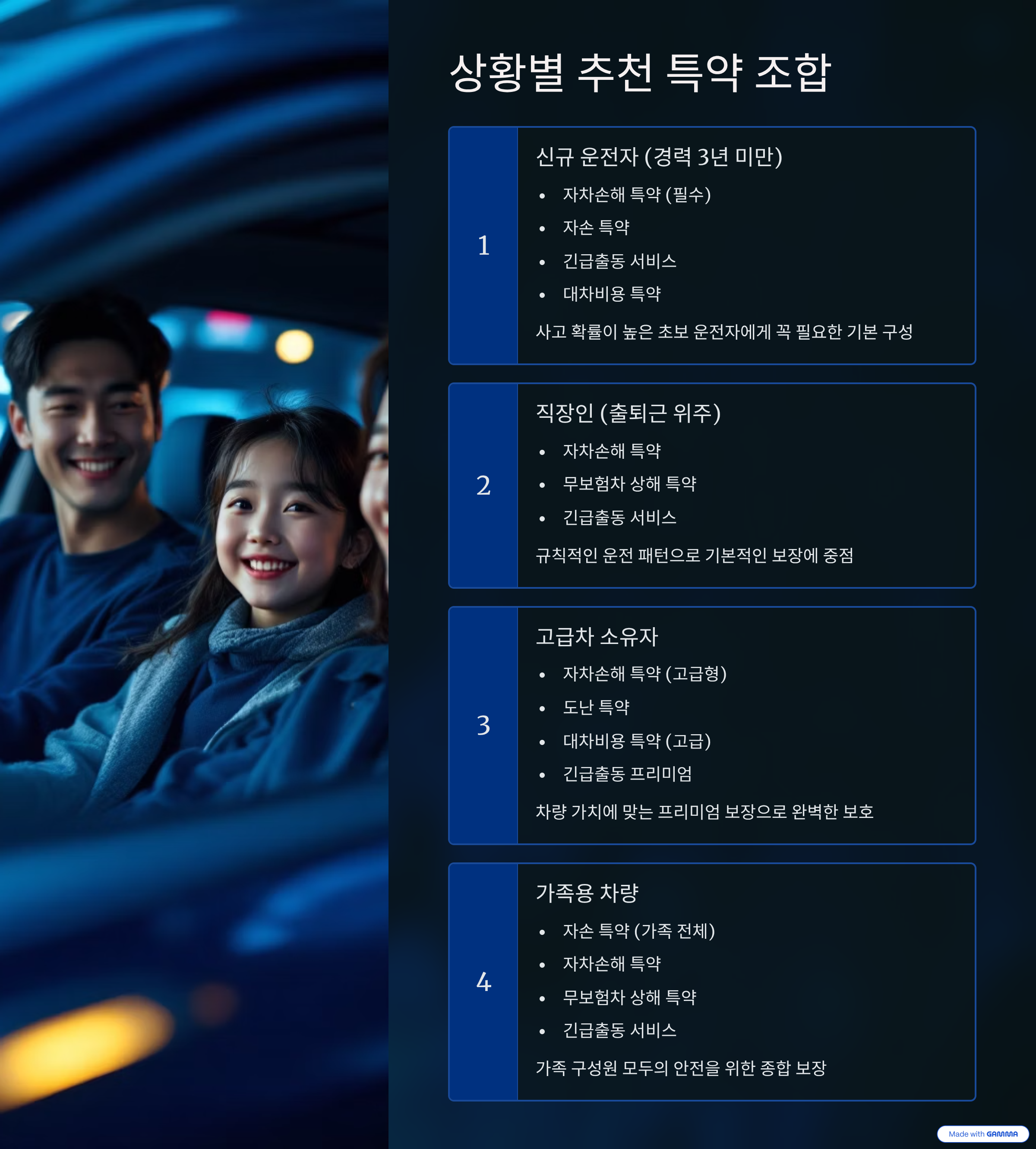 | 자녀가 있는 부모 | 자녀 할인, 긴급출동, 신체사고 강화 | 가족 보호 중심 보장 |